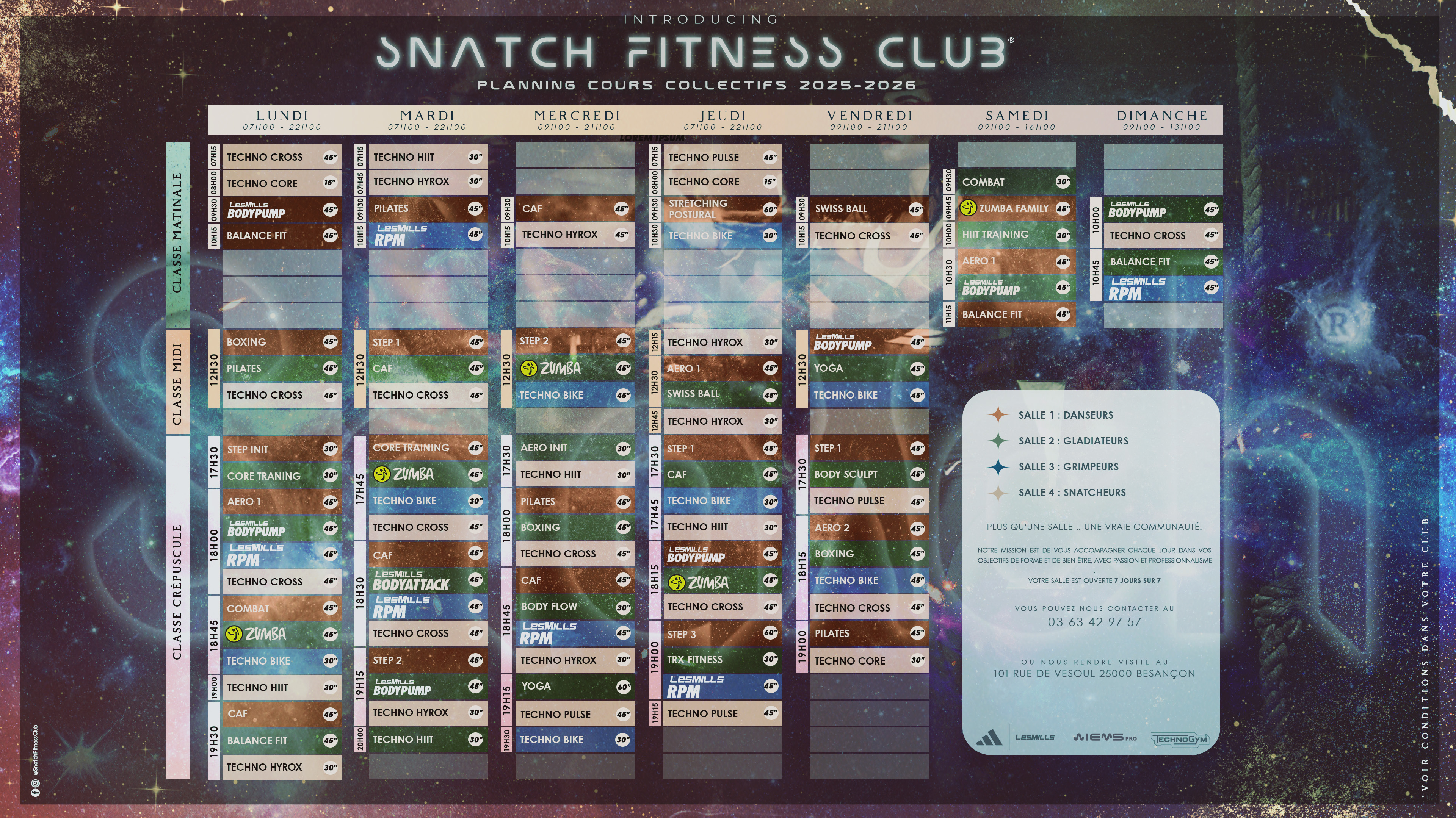 Au-delà des équipements et des cours, Snatch Fitness Club c'est aussi une ambiance conviviale et motivante ou chacun trouve sa place. Nos coachs vous accompagnent avec des conseils adaptés et un suivi régulier pour vous aider à progresser en toute confiance. Que ce soit pour améliorer vos performances, reprendre le sport ou simplement vous dépenser après une journée de travail, vous trouverez ici un cadre idéal pour rester motivé et atteindre vos objectifs.