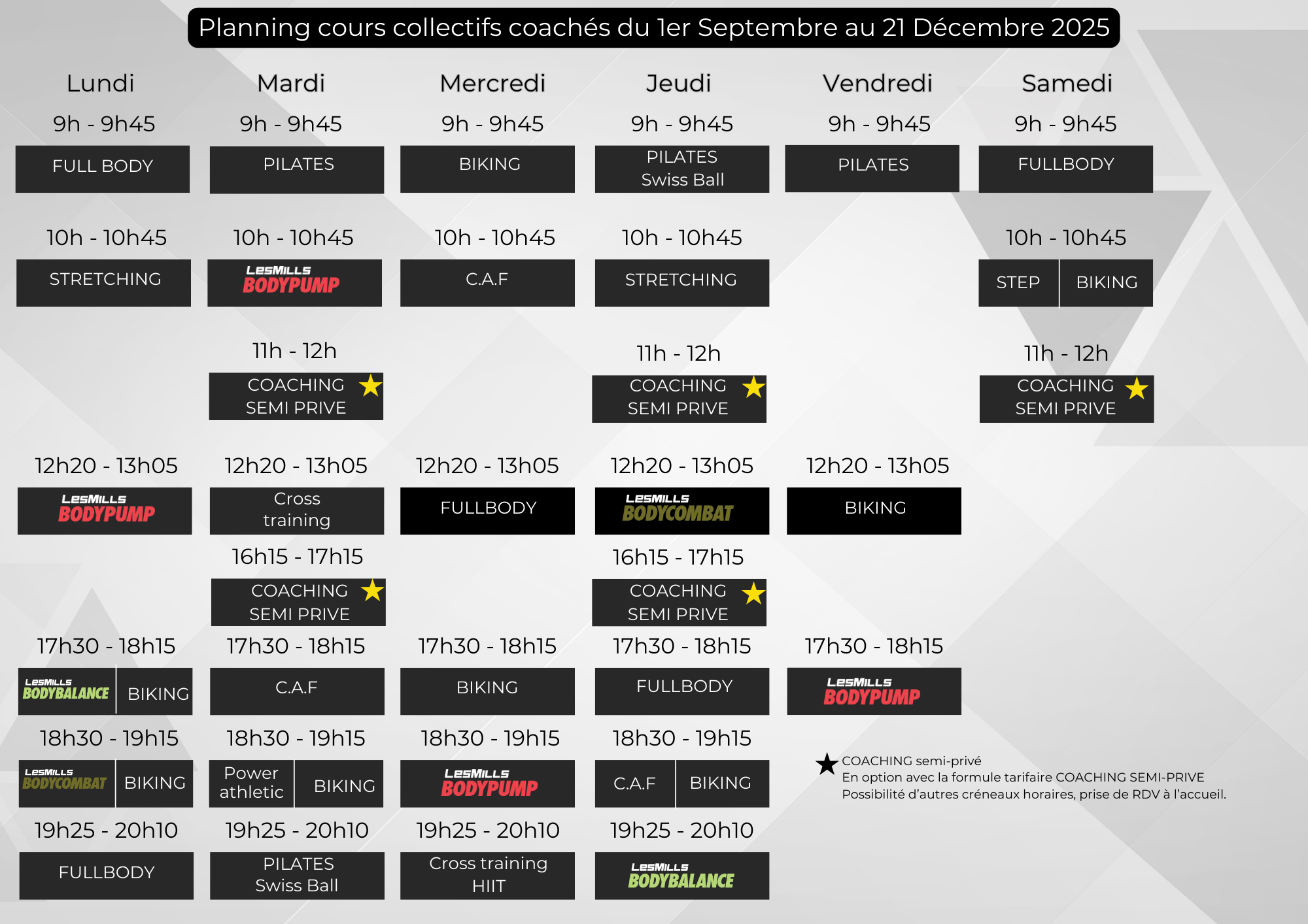 Accès illimité au plateau muscu & cardio-training / conseils et suivis personnalisés / personal training Planning de cours collectifs coachés : BodyPump /BodyCombat /BodyBalance /Renforcement musculaire /Pilates /CrossTraining /Biking /STEP