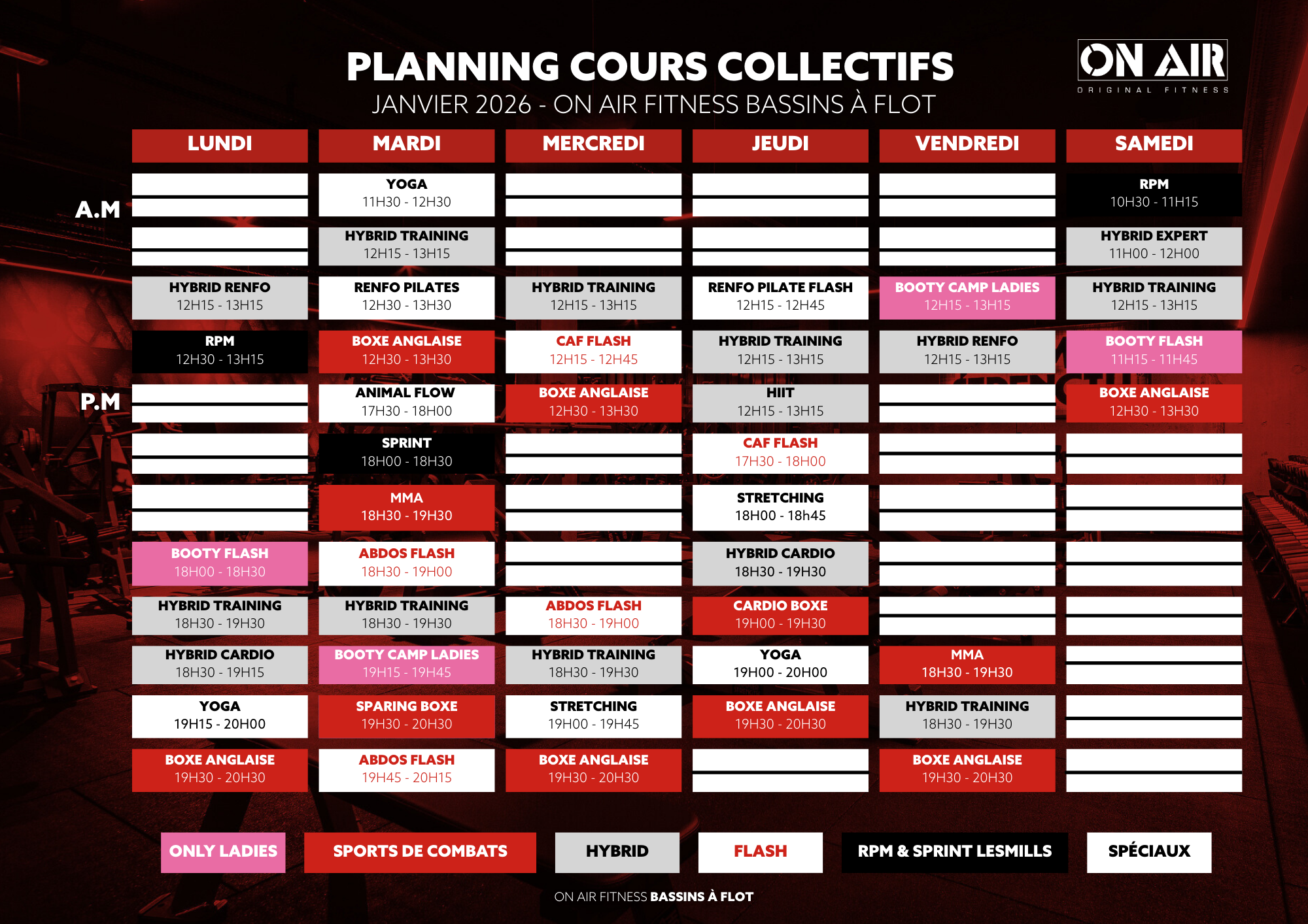 📅 Ton nouveau planning de cours collectifs est en ligne ! Bonne nouvelle 💥 Le planning cours collectifs de février est dispo à On Air Bassins à Flot ! Hybrid, RPM, Booty, Boxe, MMA, Yoga, Renfo… encore plus de variété, encore plus d’intensité 💪 🔥 Toujours en illimité pour 5€/semaine + accès à tous les clubs bordelais. 👉 Pas encore l’option ? Passe à l’accueil de ton club !