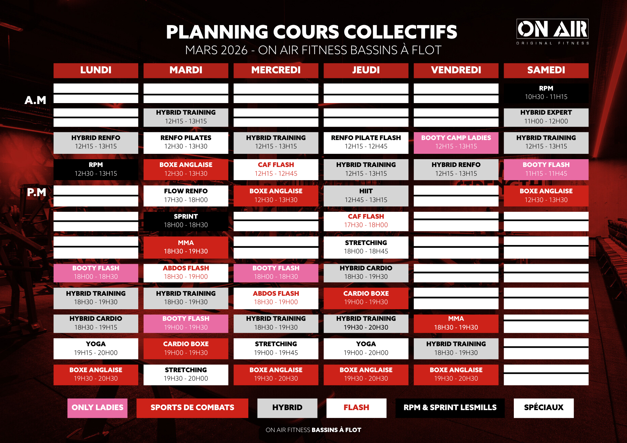 🌸 Ton nouveau planning de cours collectifs est en ligne ! Le planning de mars est dispo chez On Air Bassins à Flot ✨ Hybrid, RPM, Booty, Boxe, MMA, Yoga, Renfo… encore plus de variété et d’intensité 💪 🔥 Illimité pour 5€/semaine + accès à tous les clubs bordelais. 👉 Pas encore l’option ? Passe à l’accueil de ton club !