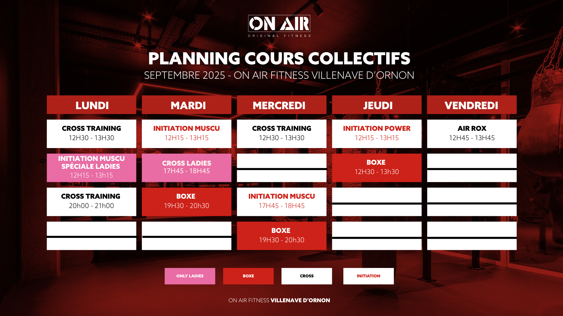 Repousse tes limites chez On Air Villenave d’Ornon avec un tout nouveau planning de cours collectifs🔥 Cross Training, Boxe, Initiation muscu, Air Rox et bien d’autres 💪 👉Envie d’en savoir davantage ? Consulte dès maintenant l’appli, rubrique “planning”, ou nos réseaux sociaux Et si tu n’as pas l’option, rdv à l’accueil de ton club😉