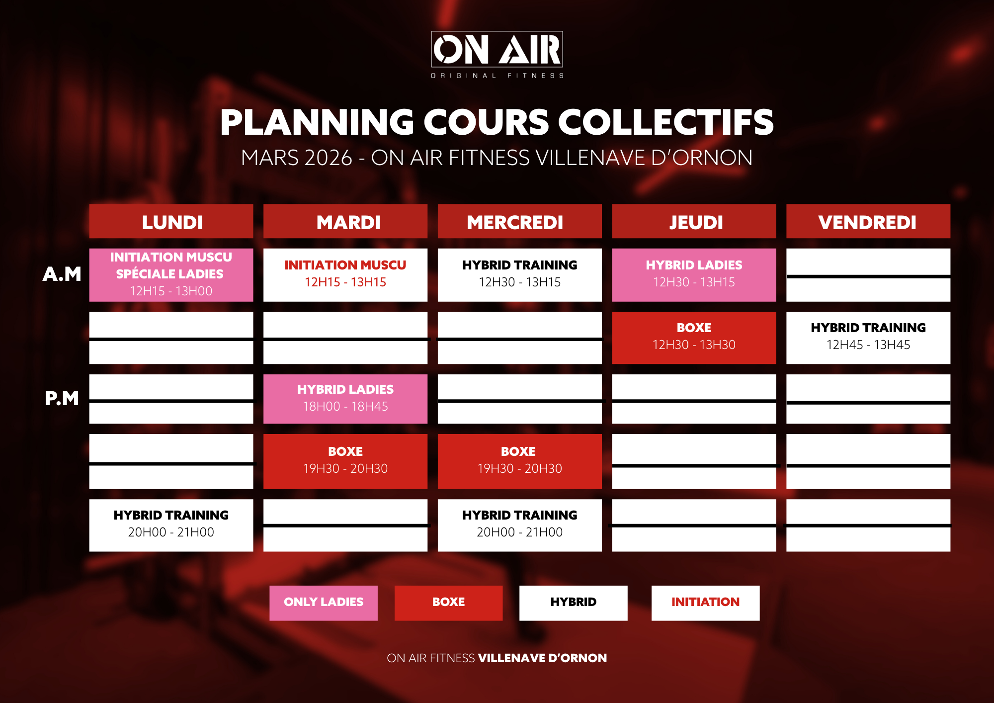📅 Découvre ton nouveau planning de cours collectifs chez On Air Villenave d’Ornon ! Le planning de février est en ligne avec des cours pour tous les objectifs : Initiation Musculation, Hybrid Training, Boxe et cours spéciaux Ladies. 💪 Plus de variété, plus d’énergie, toujours en illimité pour 5€/semaine + accès à tous les clubs bordelais. À toi de choisir ton prochain cours 💪 👉 Pas encore l’option ? RDV à l’accueil de ton club !