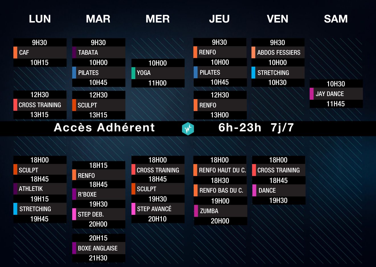 Nos coachs diplômés d’Etat vous accompagnent en cours collectifs : sportifs, endiablés ou relaxants ! Retrouvez tous nos concepts VidéoFit et diverses méthodes d’entrainement : Cross Training, Pilates, STEP, JayDance Fitness, Yoga, Abdos... Votre Wefit.club Saumur vous offre une séance découverte ! Profitez-en. Nos coachs vous accompagnent quelque soit votre niveau de pratique et vos objectifs !
