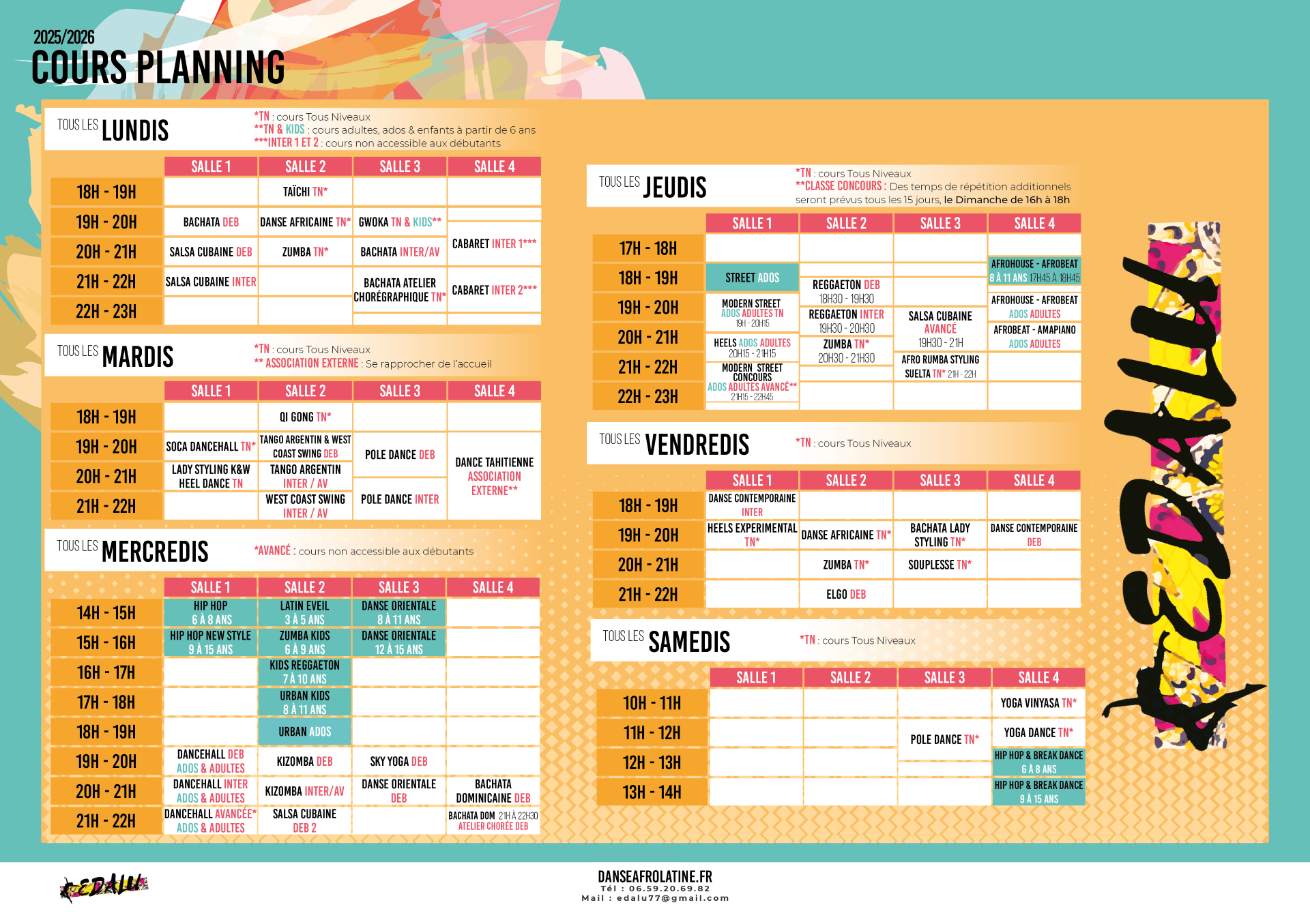 L'Ecole des Danses Afro-Latines et Urbaines propose des cours pour enfants en adultes, du lundi au vendredi, ainsi que des stages un à deux dimanche(s) par mois. Au programme de septembre à juin : Modern-dance, Zumba Kids, Zumba Teens, Hip-Hop, Ragga Dancehall, Reggaeton, Salsa, Bachata, Kizomba, Zumba, Danses Africaines , Modern Jazz, Street jazz, Gwo ka, Semba, Afro-house, Pole Dance, Cabaret. Il s'agit sans aucun doute de la plus belle offre d'activités autour de la danse dans le 77. Nos cours et nos stages sont assurés par des professeurs expérimentés. Nous proposons également une formation à destination des passionnés qui souhaitent enseigner les danses latines (Salsa, Bachata, Kizomba) ou la Pole Dance. Nous organisons chaque saison des soirées à thème, sur des musiques afro-latines Salsa, Bachata, Kizomba, Zouk, Couper-Décaler ... Enfin, nous sommes votre partenaire idéal pour l'organisation et l'animation de tous vos événements : mariage, anniversaire, enterrement de vie de jeune fille, festivals, incentive des comités d'entreprise, garden party, ... Venez vous défouler et danser comme vous aimez à l'Ecole des Danses Afro-Latines, dans une ambiance conviviale, avec des professeurs chevronnés et sympathiques ! Défoulement et bonne humeur garantis ! Cours d'essai gratuit dans la danse de votre choix, lors de nos portes ouvertes annuelles. A très bientôt sous le soleil de l'Ecole des Danses AfroLatines !